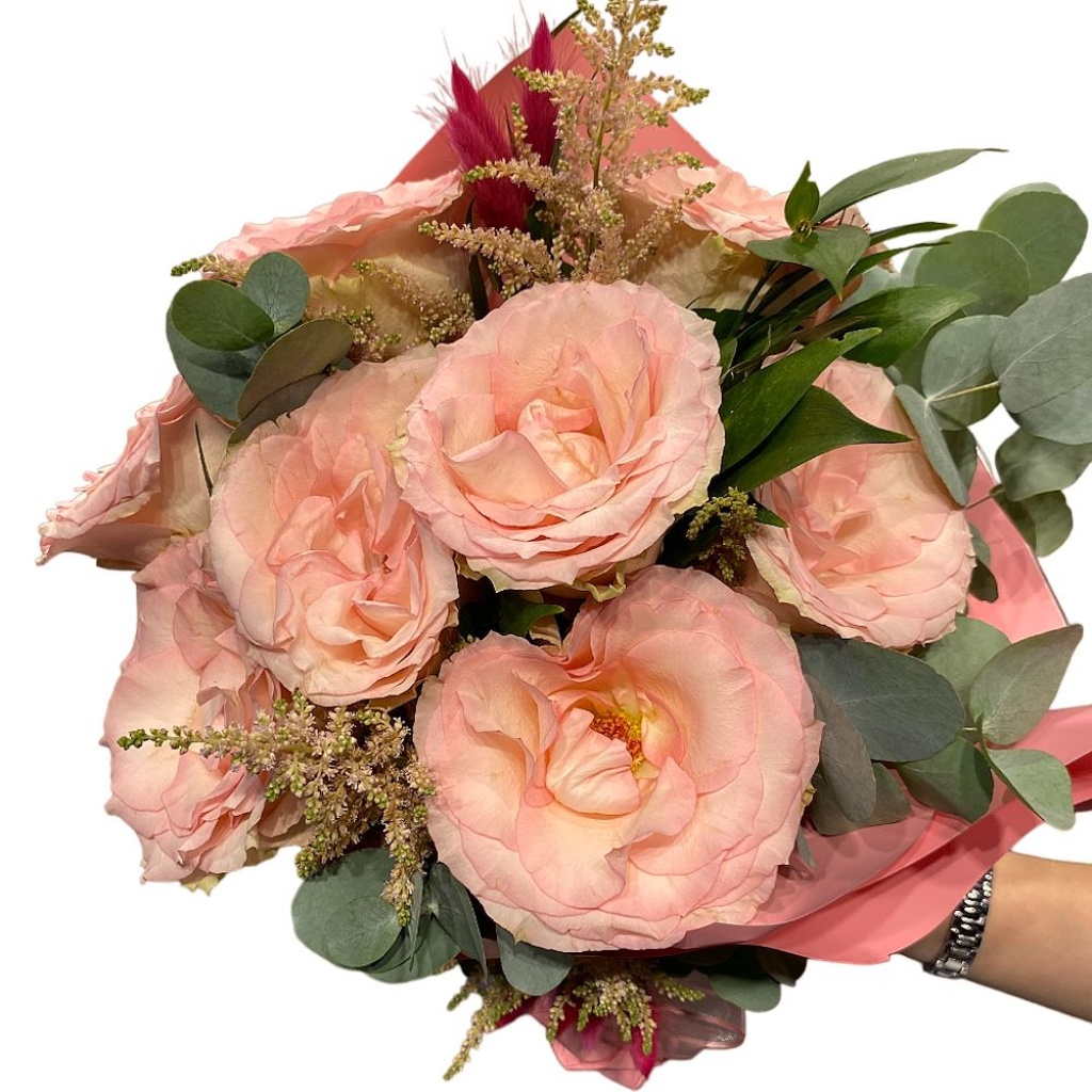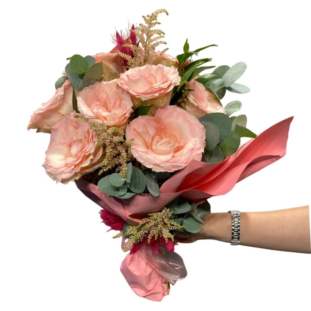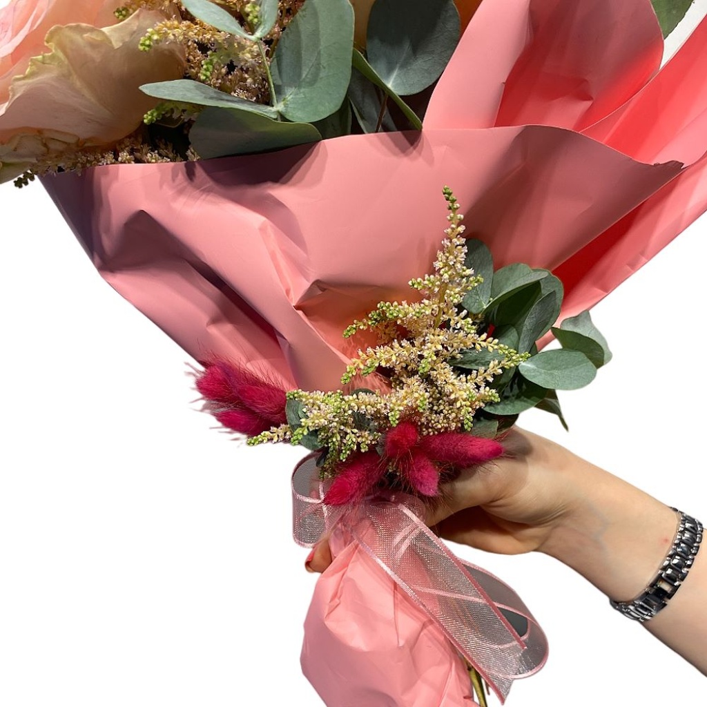 Buketin somon rengindeki büyük güller, zarafet ve duygusal bir çekicilik sunar. Bu göz alıcı güller, derin bir anlam taşır ve aşkın romantik yönünü temsil eder. Okaliptüs yaprakları, bu bukete doğal bir dokunuş katar ve serin bir hava yaratırken, ruskus ve kuru çiçeklerin eşsiz dokuları ve renkleri buketin büyülü bir görünüme sahip olmasını sağlar.
