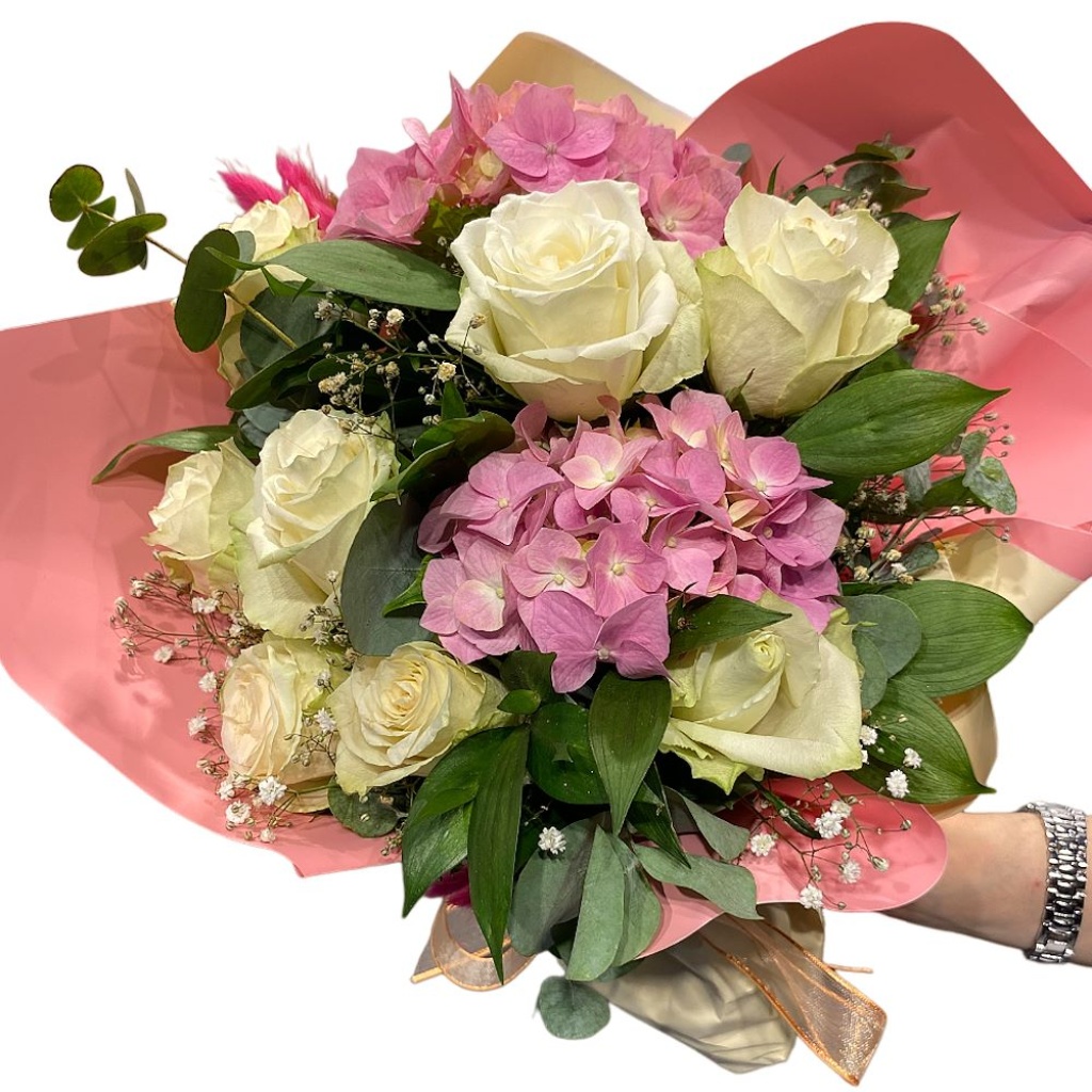 Gül ve ortanca armonisi buketi, sevdiklerinizin kalplerine dokunacak ve onlara özel olduklarını hissettirecektir.