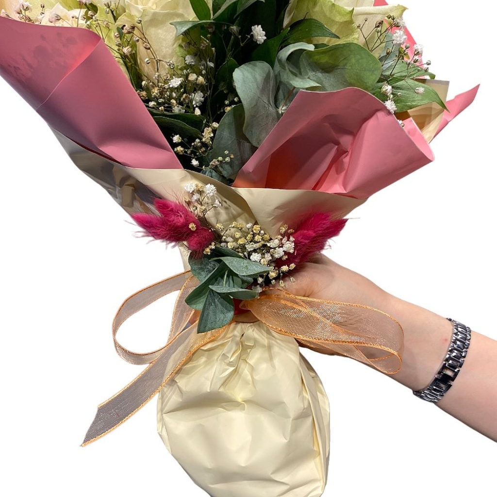 Ortanca ise zarif ve naif yapısıyla dikkat çeken bir çiçektir. Ortanca, sevgi, şefkat ve zarafetin sembolü olarak bilinir. Çiçeklenme döneminde açan bu çiçekler, sevginin gücünü ve kırılganlığını temsil eder. Ortanca, bu bukete sıcaklık ve zarafet katarken, güllerle birlikte uyumlu bir kombinasyon oluşturur.