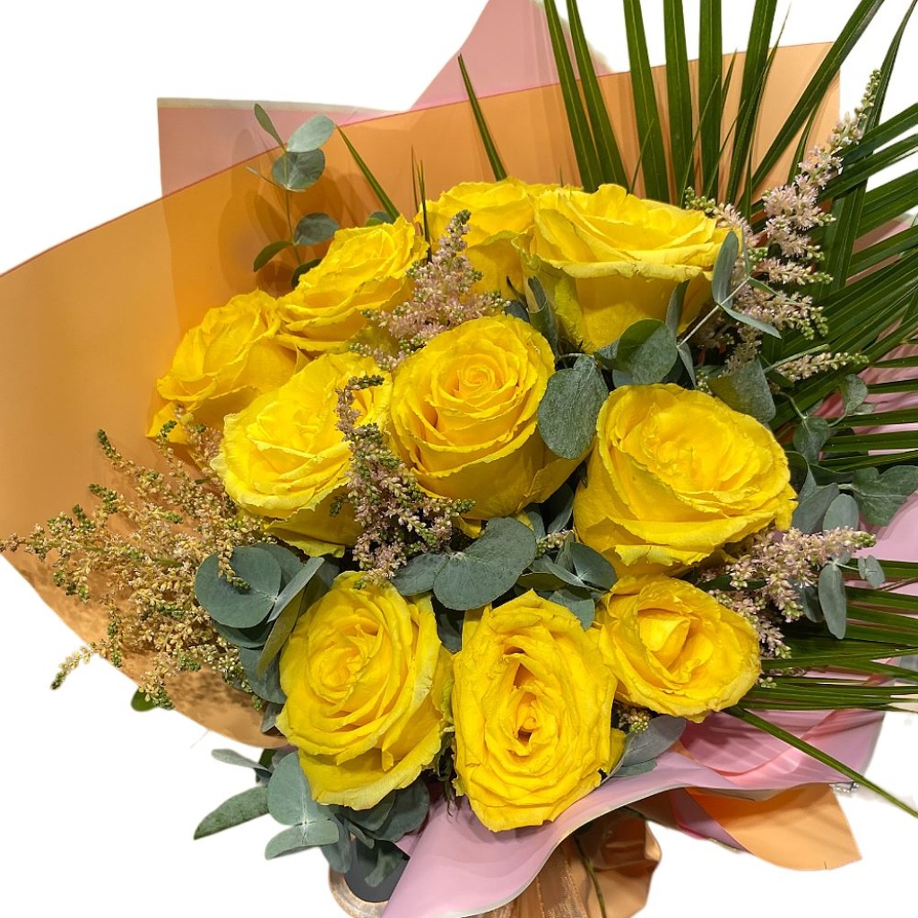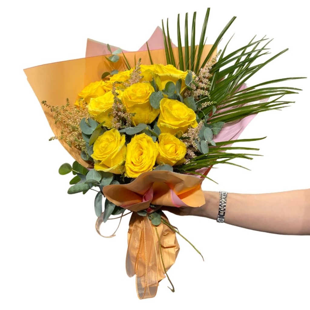 Sarı gül buketi, canlılığı, neşeyi ve mutluluğu temsil eden şık bir hediye seçeneğidir. Bu harika buket, 10 adet canlı sarı gülle doludur ve sevdiklerinizin gününü aydınlatmak için mükemmel bir yoldur.